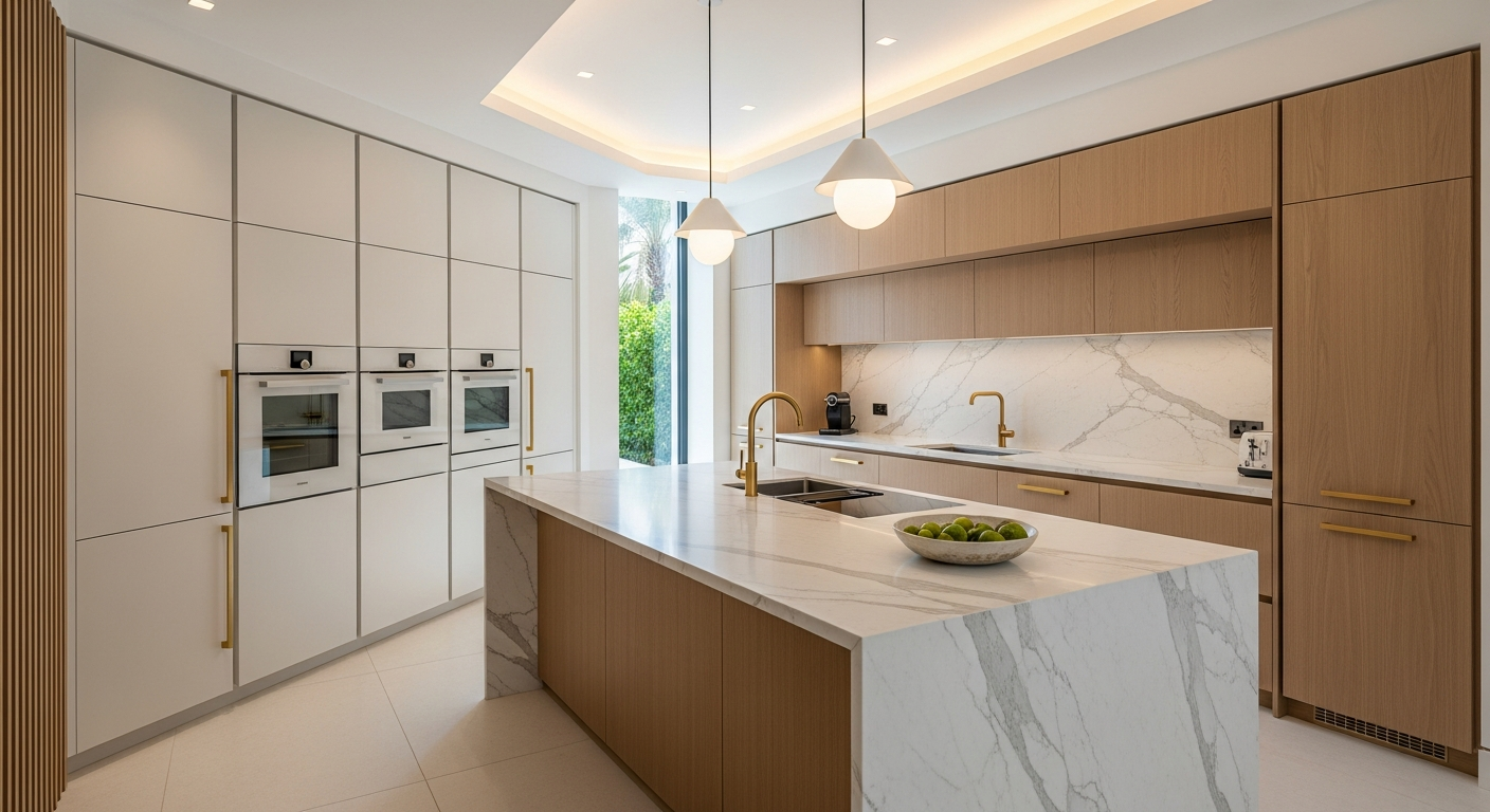 We renovate kitchens across Dubai from AED 45,000. Full scope: demolition, custom cabinetry, stone countertops (marble, quartz, or granite), backsplash tiling, plumbing, electrical, appliance integration, and handover in 4-6 weeks. In-house team, no subcontractors, 3-Year Warranty. Price includes a free 3D design so you approve the exact layout, materials, and finishes before any work begins. We use soft-close Blum hardware, premium under-cabinet lighting, and source countertops directly — Italian Calacatta, Carrara, Caesarstone, or Dekton. 200+ kitchens delivered across Palm Jumeirah, Arabian Ranches, Emirates Hills, Dubai Hills, and every major villa community in Dubai.