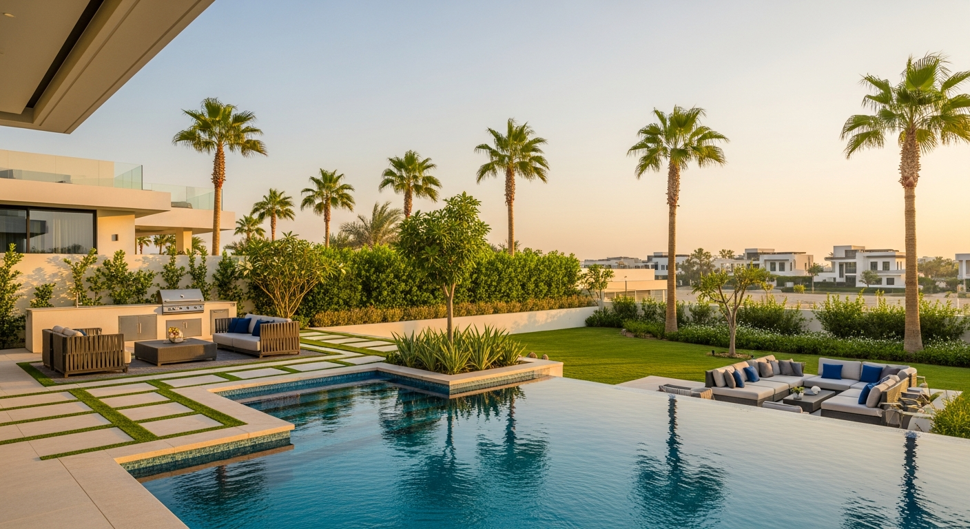 Custom swimming pool: structural engineering, excavation, mosaic tiling, filtration, LED lighting, and landscaping — from AED 45,000, built in 6-10 weeks.